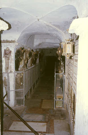 Unterirdisches Gewölbe im Bereich des Kapuzinerkonvents, Begräbnisstätte im späten 18. und 19. Jahrhundert. Auf Grund der mikroklimatischen Verhältnisse sind die Toten nicht verwest, sondern wurden durch Austrockung mumifiziert.