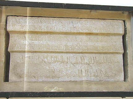 Inschrift in lateinischer, griechischer und arabischer Sprache in Innenhof (am Eingang zur Capella Palatina), zur Erinnerung an eine unter König Roger II, 1142 erbaute Wasseruhr.
