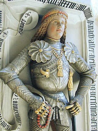 Ein stolzer Ritter in seiner RüstungOberkörper des Ritters Georg Sack: Brustpanzer mit Harnischkragen, Schwebescheiben und Rüsthaken; Armzeuge mit Ellenbogenkacheln und Handschuhen. In der rechten Hand ein Rosenkranz. |