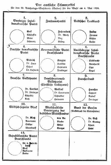 Stimmzettel zur Reichstagswahl (Baden), 4. Mai 1924