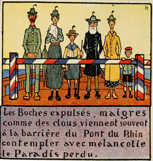| Politische Karikatur Übersetzung: Die vertriebenen Boches, dürr wie ein Nagel, kommen an die Grenze an der Rheinbrücke, um melancholisch in das verlorene Paradies hinüberzublicken. Rheinübergang / 1918 / Rückkehr ins Land der Geburt Zinkografie, Hansi, 1919 |