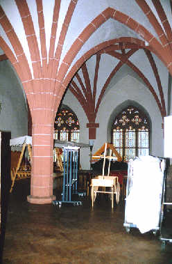 Das Obergeschoss des Fassbaus ist ein Nebenraum zum heutigen Königssaal und dient dem Pächter als (übrigens dringend notwendige) Abstellkammer. Das spätgotische Gewölbe ist im Grunde anachronistisch, denn das Gebäude wurde 1579 errichtet, als alle Welt längst in den Formen der Renaissance baute. Um es für diese Aufnahme zur Geltung zu bringen, hätte man den Raum leerräumen müssen - der Pächter wäre begeistert gewesen. |