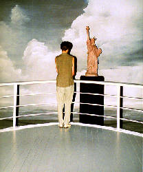 Schlussbild der Ausstellung "1848 - Aufbruch zur Freiheit" Die Installation der Ausstellungsmacher bestand aus einer Schiffsreling (Symbol für die Auswanderung) und dem Terrakottamodell der New Yorker Freiheitsstatue (Symbol für die Freiheit). Die Assoziation an Titanic (damals grad aktuell) lag nahe. |