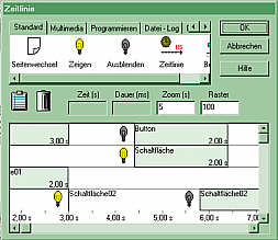 Start" in das (bis dahin leere) Aktionsfenster. Ziehen Sie dann von oben die Funktion "Zeitlinie" hinter den "Mausklick" im Aktionsfenster. Beide werden durch gelben Blitz verknüpft und das Fenster "Zeitlinie" öffnet sich. |