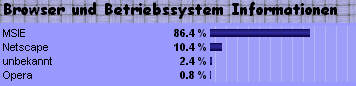 ... können gerade im Schulbereich auch heute noch ganz deftige Ausrutscher in dieser Statistik vorkommen. Die Server- und Browserstatistik für diese Website verzeichnet ein ähnliches Bild, mit Netscape-Quoten zwischen 9 und 14%. Überraschenderweise wurden jedoch in der Woche vom 11.02.02 bis 17.02.02 mit 1.801 Zugriffen insgesamt mit 16,32 % Netscape 3.0-Browser genutzt. Ob das eine Sammelbestellung einer Schulklasse war ? |