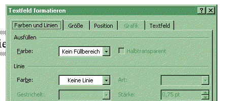 Im Formatiermodus (gepunkteter Rand) können sie das Textfeld selbst formatieren. Klicken Sie dazu entweder doppelt mit der linken oder einfach mit der rechten Maustaste auf den Rand des Textfeldes und wählen Sie in letzterem Fall aus dem Kontextmenü die Option "Textfeld formatieren". | |||