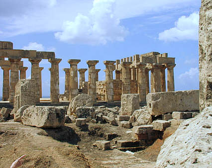 Der westliche Teil des Tempels. Gut zu erkennen die Mauern der Cella und das Gebälk von Opisthodom und Westseite. Im Vordergrund die Ruinen von Tempel F.