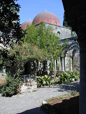 Blick aus dem Kreuzgang auf das durch zwei Kuppeln bekrönte Langhaus der Kirche