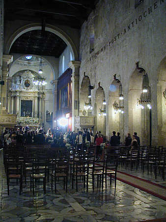 Mittelschiff nach Osten mit den in die alte Cellawand eingebrochenen Arkaden der frühchristlichen Basilika und dem barockem Hochaltar von 1659.