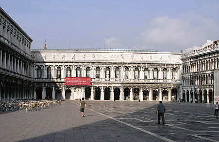 Öffentliches Zentrum der Stadt. Rechts die Procuratie Vecchie (um 1500 - um 1534), links die Procuratie Nuove (Vincenzo Scamozzi, 1583, vollendet 1640 von B. Longhena), dazwischen die Ala Napoleonica (1810).