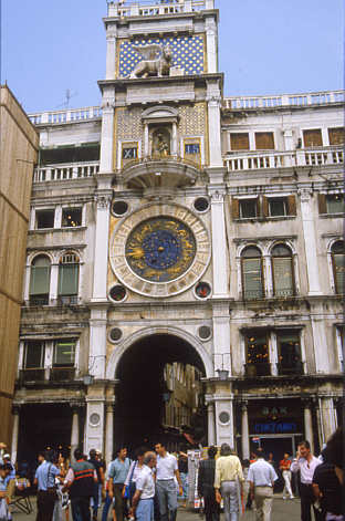 (Uhrturm) 1496 - 99 als Dominante in der Mündung der Merceria auf die Piazza di San Marco errichtet. Bronzefiguren 1497 von Paolo Salvin. 3. Obergeschoss 1755 von G. Massari.