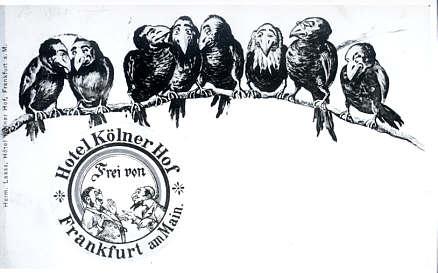 "Krähen". Das Franfurter Hotel "Kölner Hof" wirbt mit diedser Postkarte für sich. Erläutere die Werbebotschaft, vor allem auch im Hinblick auf das verwendete Rabenmotiv. |