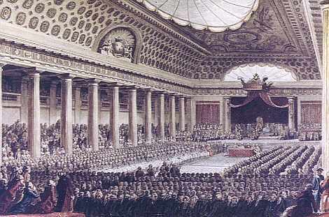 Eröffnungssitzung der Generalstände im Grande Salle des Menus plaisirs im Residenzschloss von Versailles. Das offizielle Bild zeigt die festliche Förmlichkeit, die die Sitzung prägte.