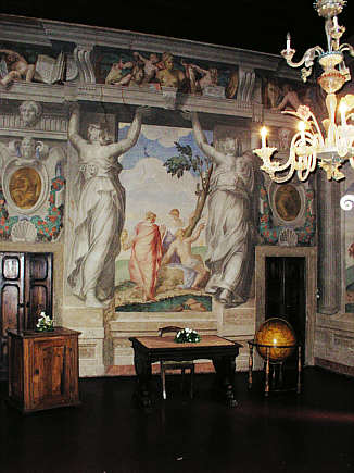 Fresko von Battista del Moro: Karyatiden tragen ein reich skulptiertes Gebälk, zwischen ihnen öffnet sich der Blick in eine Szene mit Musen und Poeten