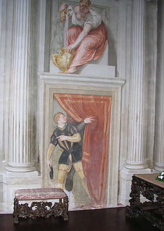 Fresko von Gianbattista Zelotti: Gemalte Nische mit einem jungen Mann, der hinter einem von einem weiteren Mann aufgehaltenen Vorhang heraustritt. Darüber die Allegorie der Mäßigung.