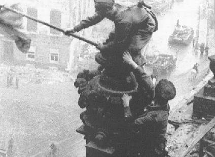 Sowjetische Soldaten hissen in der Stunde des Sieges die Rote Fahne auf dem Berliner Reichstagsgebäude