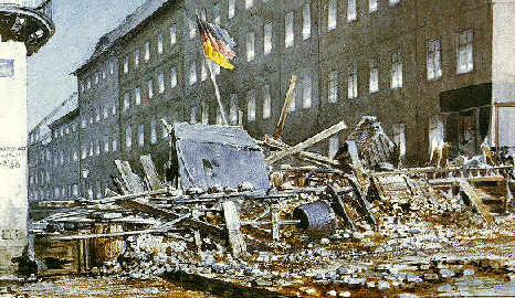 Eduard Gaertner (1801 - 1877): Barrikade nach Kämpfen in der Breiten Straße Untypische, die Barrikade als Bauwerk zeigende Darstellung |