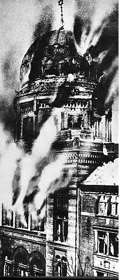 Noch die Heidelberger Rhein-Neckar-Zeitung brachte zum 50. Jahrestag des Progroms am 9.11.1998 dieses Bild als "authentische" Illustration. Längst ist es allerdings als Fälschung entlarvt, hergestellt, als man 1948 zum 10. Jahrestag eine Illustration brauchte, aber kein Bild zur Verfügung hatte. Es zeigt daher die kriegszerstörte Vorderfront des Bauwerks mit aufretuschierten Rauchschwaden. Ironie der Geschichte, dass eben diese Synagoge NICHT brannte, weil ein beherzter Polizist die anrückenden SA-Männer kurzerhand hinauswarf. |