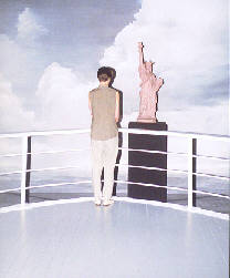 Schlussbild der Ausstellung "1848 - Aufbruch zur Freiheit" Die Installation der Ausstellungsmacher bestand aus einer Schiffsreling (Symbol für die Auswanderung) und dem Terrakottamodell der New Yorker Freiheitsstatue (Symbol für die Freiheit). Die Assoziation an Titanic (damals grad aktuell) lag nahe. |