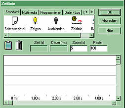 Start" in das (bis dahin leere) Aktionsfenster. Ziehen Sie dann von oben die Funktion "Zeitlinie" hinter den "Mausklick" im Aktionsfenster. Beide werden durch gelben Blitz verknüpft und das Fenster "Zeitlinie" öffnet sich. |