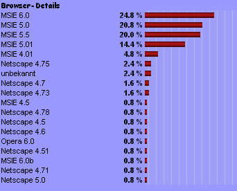 ... können gerade im Schulbereich auch heute noch ganz deftige Ausrutscher in dieser Statistik vorkommen. Die Server- und Browserstatistik für diese Website verzeichnet ein ähnliches Bild, mit Netscape-Quoten zwischen 9 und 14%. Überraschenderweise wurden jedoch in der Woche vom 11.02.02 bis 17.02.02 mit 1.801 Zugriffen insgesamt mit 16,32 % Netscape 3.0-Browser genutzt. Ob das eine Sammelbestellung einer Schulklasse war ? |