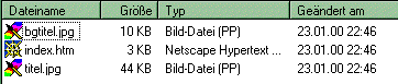 Speichern Sie über Menü Datei > "Speichern unter" die Seite an der Stelle Ihrer lokalen Festplatte ab, an der Sie sie auch wiederfinden. Für eine einzelne Seite können Sie den Dateinamen verändern, wenn auf die Seite an anderer Stelle verlinkt wird, sollten Sie den Dateinamen belassen. Ihr Explorer zeigt dann folgende Dateien: |