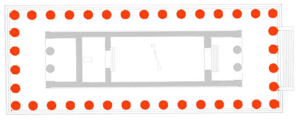 Umlaufender Säulengang, der das Bauwerk allseits geöffnet erscheinen lässt. Steht auf dem Stylobat, der obersten Stufe der Krepis, auf